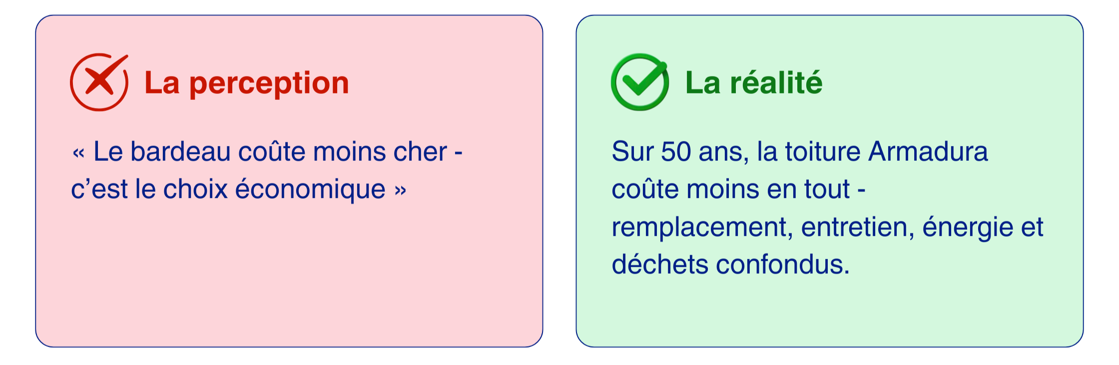 Sur 50 ans, un propriétaire peut s'attendre à deux ou trois remplacements complets de bardeau. Chaque cycle génère des déchets, des émissions de transport, de la perturbation — et une nouvelle dépense imprévue. La toiture Armadura, elle, n'a besoin que d'une seule installation.