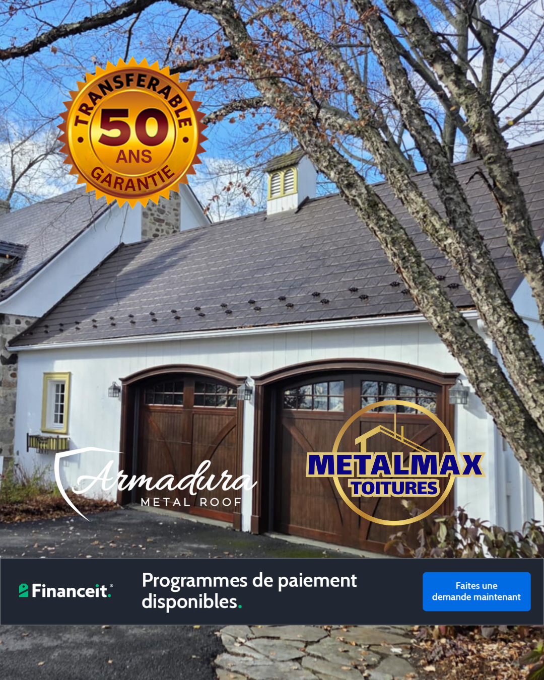Les toitures métalliques Armadura™ installées par MetalMax™ sont couvertes par une garantie transférable de 50 ans, offrant une tranquillité d’esprit durable. Cette garantie reflète la qualité du matériau, la rigueur de l’installation et la vision à long terme de notre entreprise.